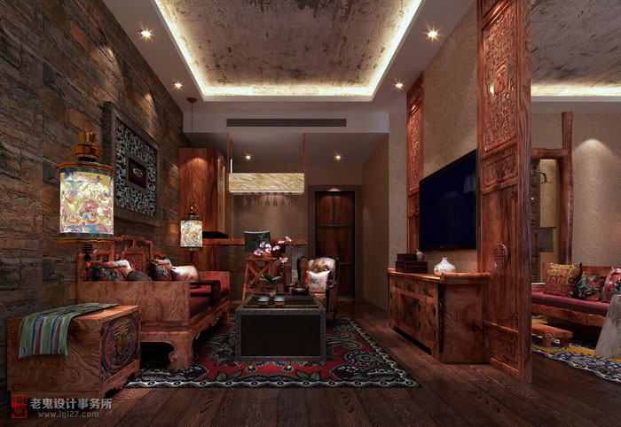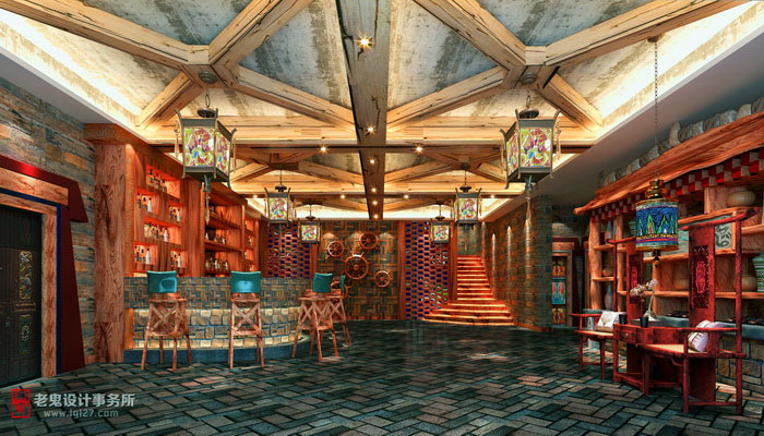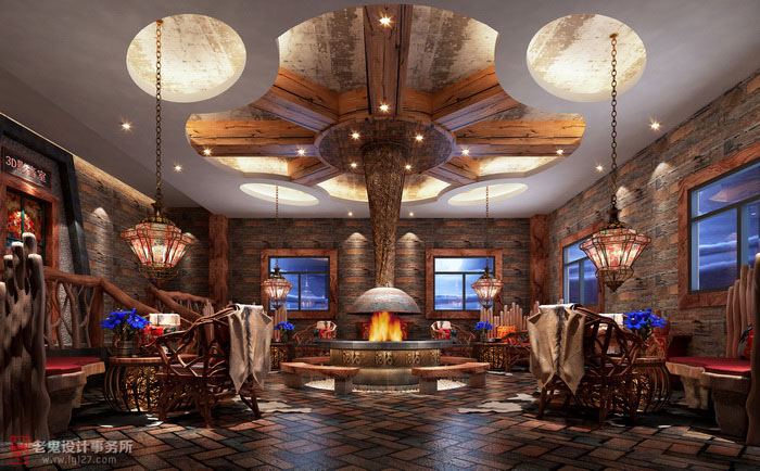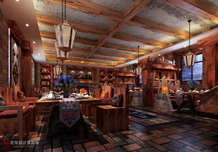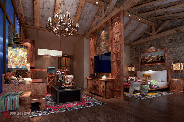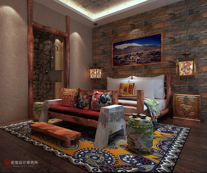 稻城亞丁位于四川甘孜藏族自治州南部,被譽(yù)為“最后的香格里拉”、“藍(lán)色星球上最后一片凈土”。借助這樣的地域優(yōu)勢(shì),本案的設(shè)計(jì)更多將會(huì)詮釋一種獨(dú)特的精品、文化、藝術(shù)的體驗(yàn)感。設(shè)計(jì)過(guò)程中,設(shè)計(jì)師選擇了結(jié)合當(dāng)?shù)卦丶右员憩F(xiàn),通過(guò)具有代表性的藏族文化元素給觀者以極強(qiáng)的文化代入感。諸如藏刀、藏族服飾、藏族飾品等大眾日常生活中司空見(jiàn)慣的元素,在本案的設(shè)計(jì)中,均發(fā)揮了舉足輕重的作用。同時(shí),作為“鬼派設(shè)計(jì)”的表現(xiàn)者,設(shè)計(jì)師老鬼習(xí)慣于結(jié)合自然和傳統(tǒng)來(lái)詮釋自己的設(shè)計(jì)語(yǔ)言,古船木、原木、石材的選擇被設(shè)計(jì)師賦予了新的精神。